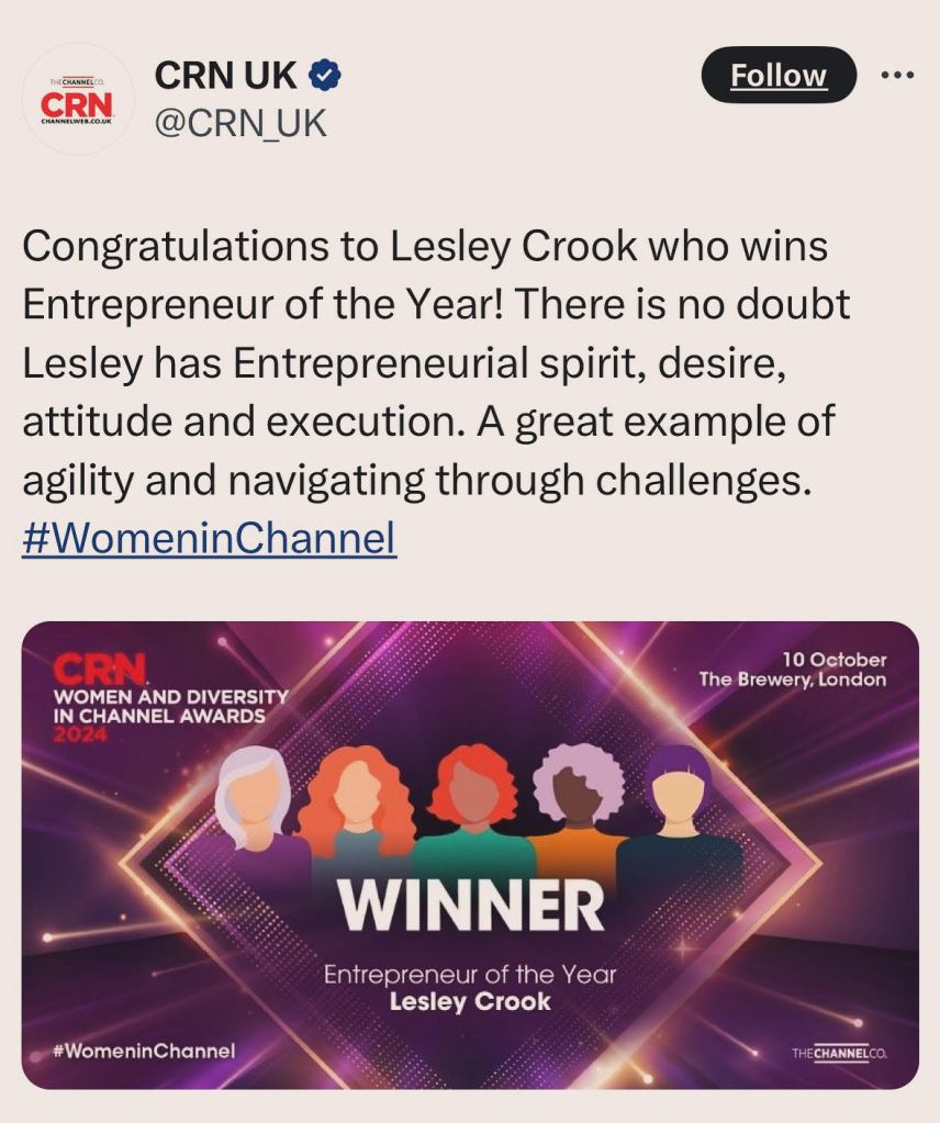 10 October 2024, I won CRN Women & Diversity in Channel Awards 2024 – Entrepreneur of the Year! I am as stunned as you are! Of course delighted as never regarded myself as an entrepreneur. I appreciate now that you can be an entrepreneur (or intrapreneur) if you are a visionary, oodles of energy and not immediately expecting a financial reward. However, they can feel isolated, especially when bringing their overpowering vision to life. Having a solid support network and mentors is essential. I have many big visions!