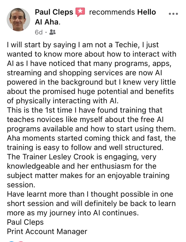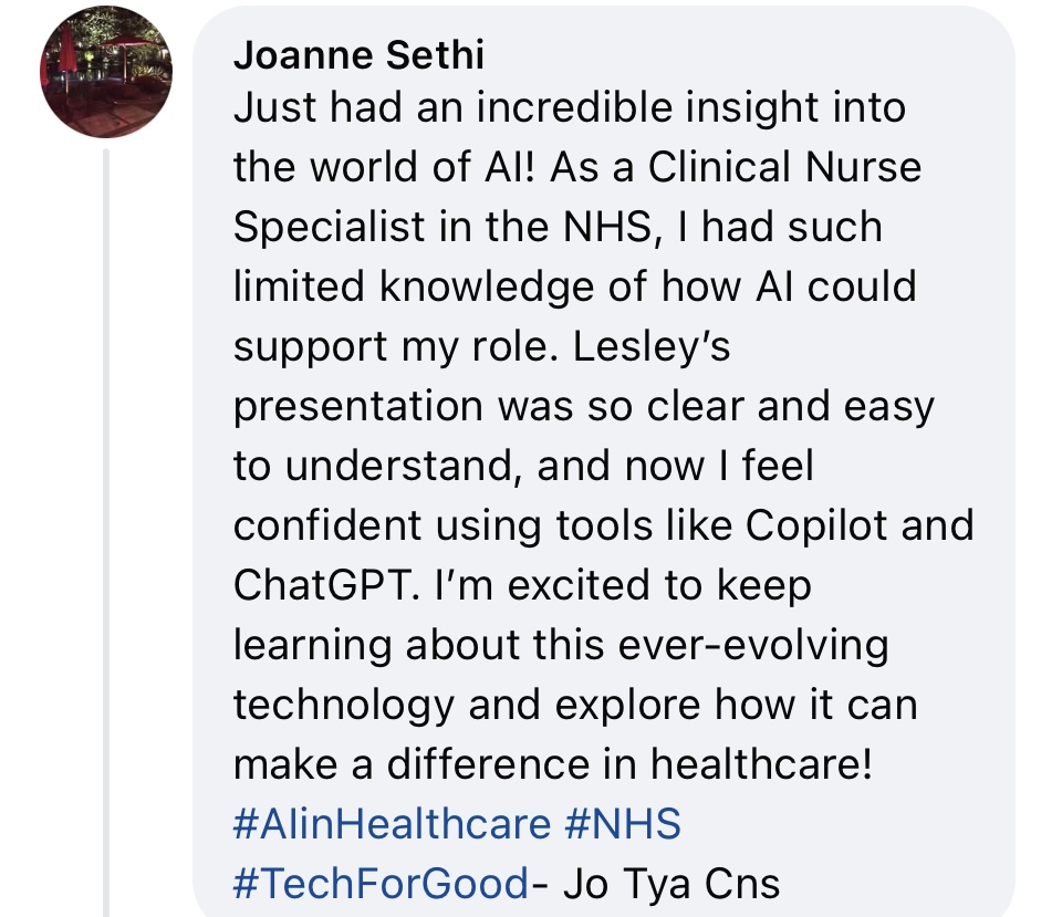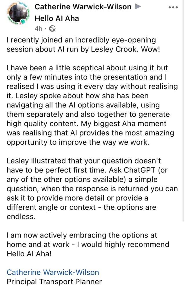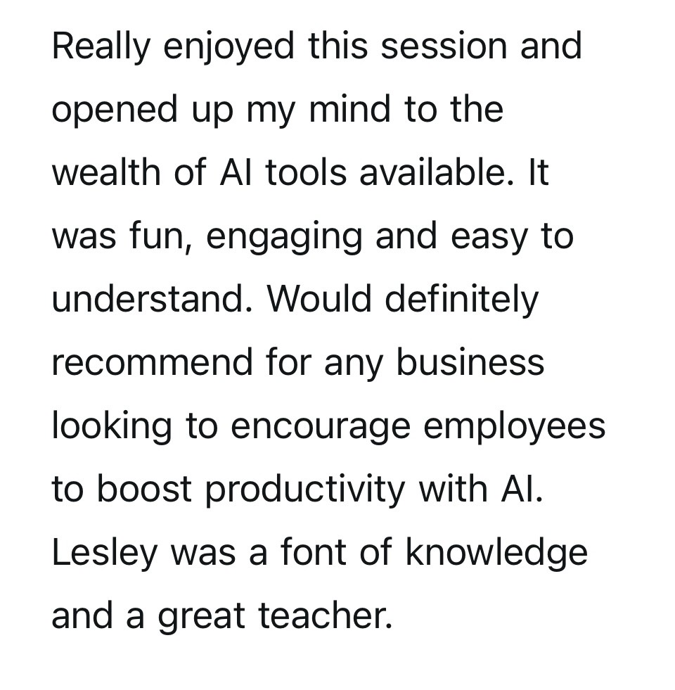 1. Really enjoyed this session and opened up my mind to the wealth of AI tools available. It was fun, engaging and easy to understand. Would definitely recommend for any business looking to encourage employees to boost productivity with AI. Lesley was a font of knowledge and a great teacher.