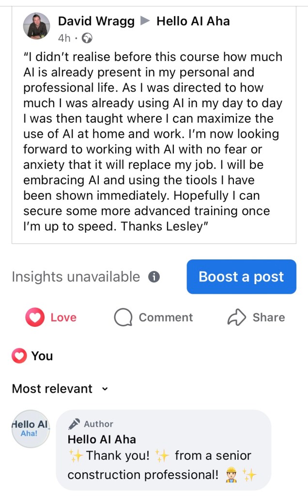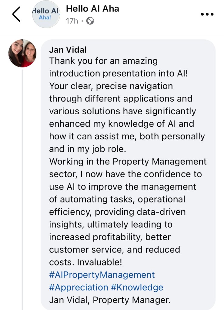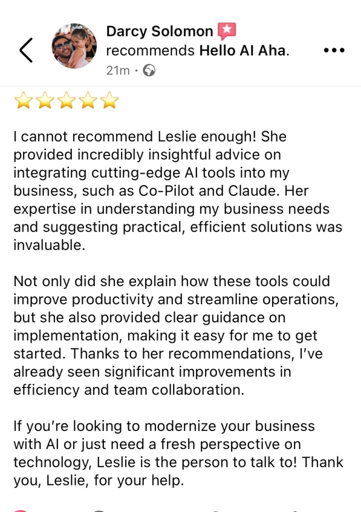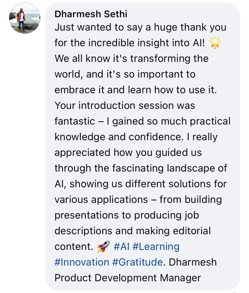 1. Really enjoyed this session and opened up my mind to the wealth of AI tools available. It was fun, engaging and easy to understand. Would definitely recommend for any business looking to encourage employees to boost productivity with AI. Lesley was a font of knowledge and a great teacher.