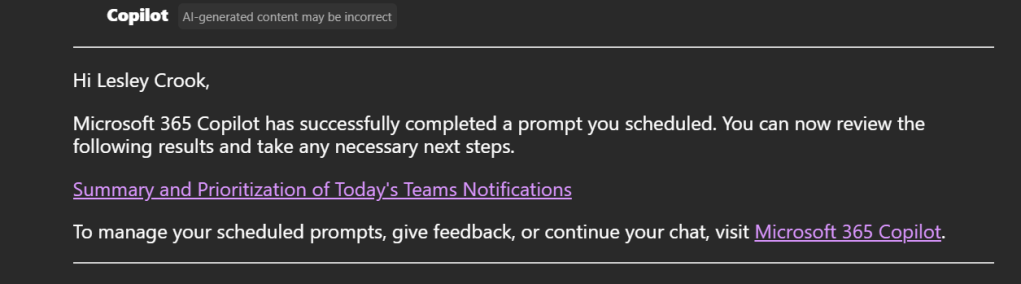From Copilot: “However, just to be clear: I can’t schedule recurring automated summaries on my own (like every day at 9 AM), because I can’t perform tasks asynchronously or trigger future actions.
